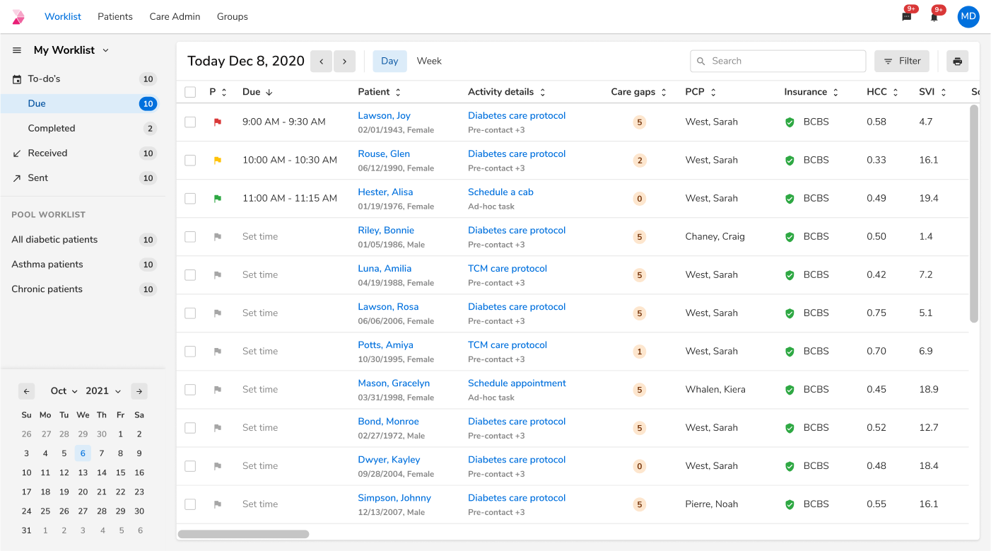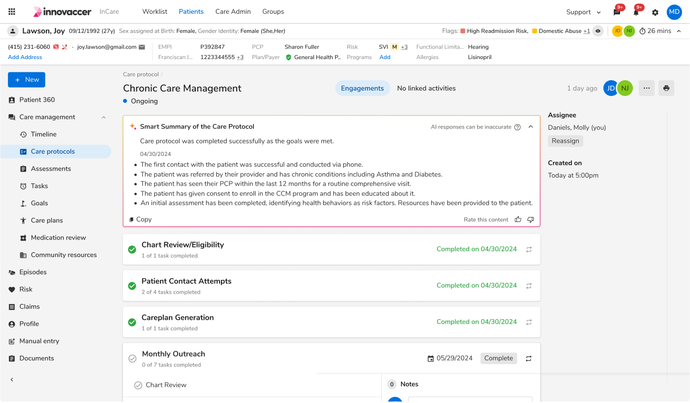 Intelligent algorithms enrich the data the previous stage with deep insights. Out of the box, this includes each patient’s disposition toward quality measures (numerator, denominator, exclusions), risk and social vulnerability profiles, gaps in care, engagement data, next best actions, and more.