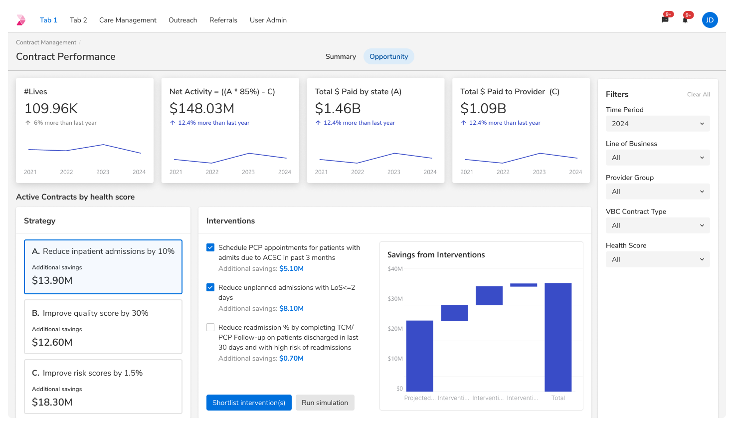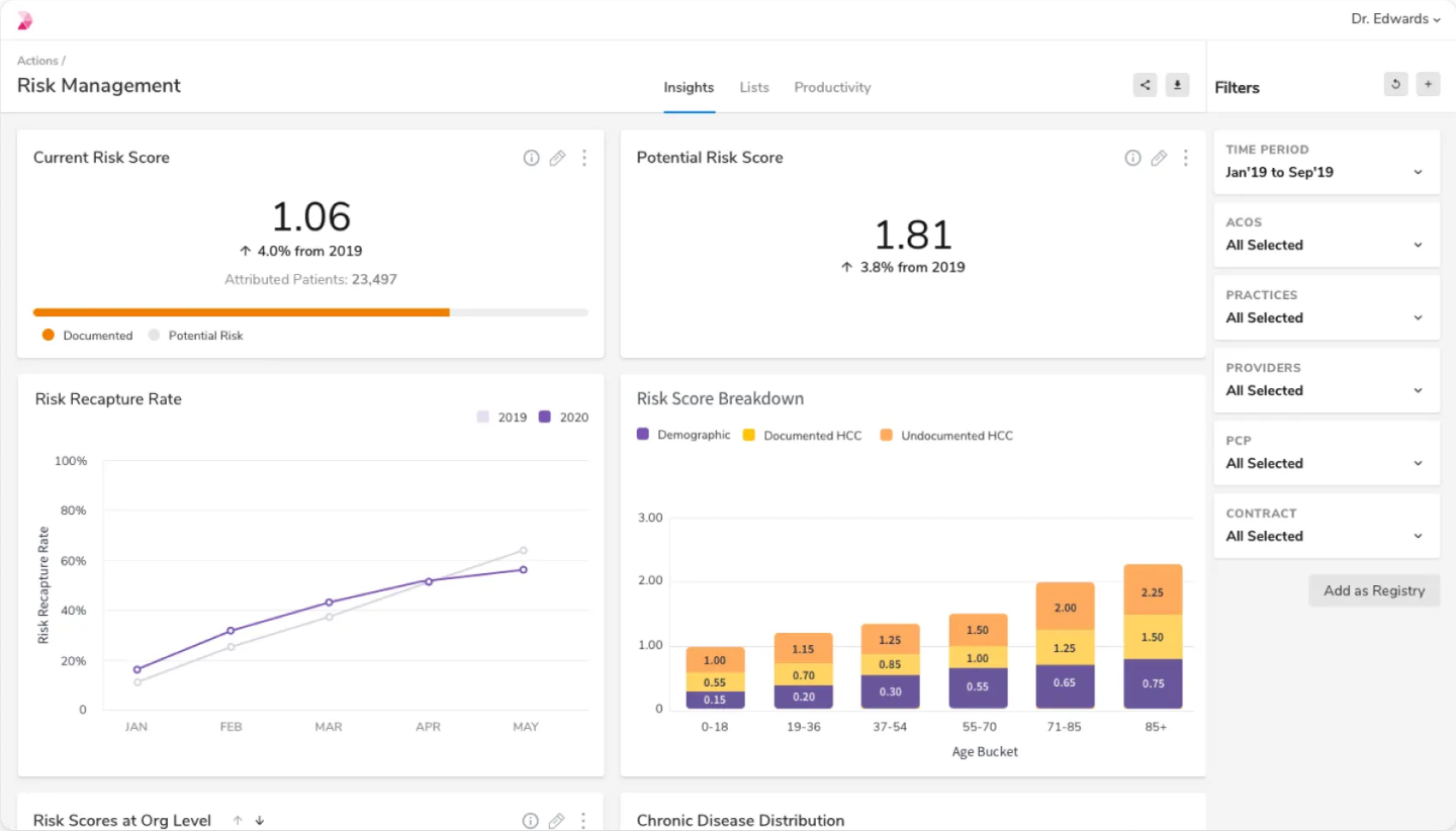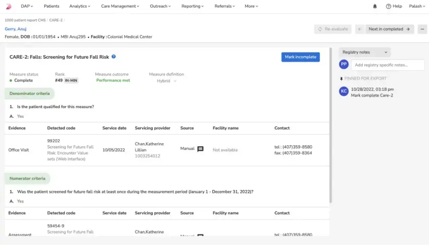 Intelligent algorithms enrich the data the previous stage with deep insights. Out of the box, this includes each patient’s disposition toward quality measures (numerator, denominator, exclusions), risk and social vulnerability profiles, gaps in care, engagement data, next best actions, and more.